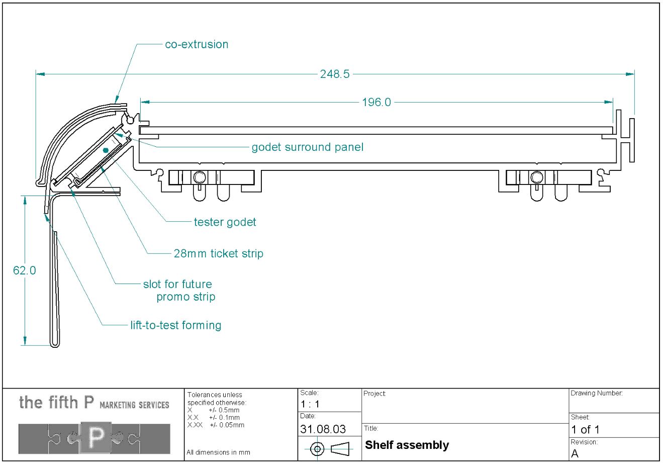 We started working with INNOXA (now distributed by Heritage Brands) in 2002 and developed a modular display system that rolled out over the following 10 years through pharmacy, DDS and Priceline Australia wide. The key engineering challenge for the system was around the shelves. The unit was completely rear illuminated giving a glow from behind the product area as the fluoro lights came through the opal acrylic rear panel. To achieve this, the product shelves had to fix from the sides, not to the rear wall. The shelves were an aluminium extrusion and four injection moulded sliding clips in the ends snapped into vertical aluminium blades with a series of holes for adjustment. The shelf design was specifically designed so that the product locating trays could be routed frosted acrylic rather than the traditional vacformed option. This was a cheaper option given the small production runs and saved tooling costs and time.