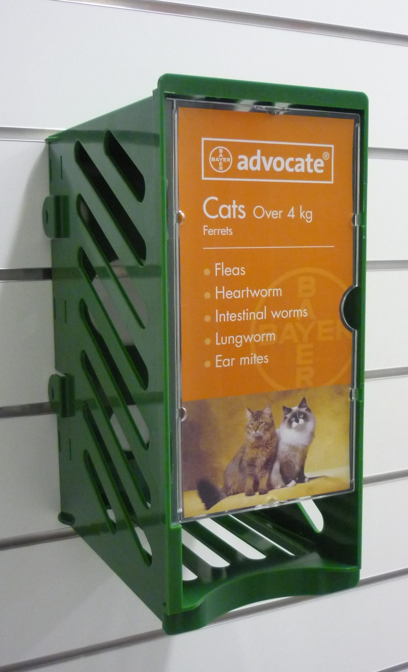 The modules can be attached to slatwall or pegboard and once the modules are clipped together, there is a facility to incorporate a large horizontally sliding graphic. This gives Bayer better opportunity to communicate with the customer who is standing on the other side of the counter. The modules are PMS colour-matched to Bayer-green.