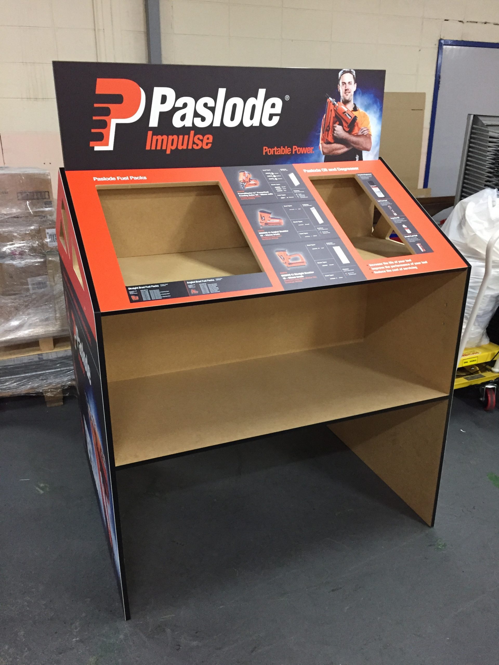 - Reinforce the market leading position of PASLODE with large graphics and brand colours. We also incorporated the truss shape to the sides to reflect the relationship to the building industry,